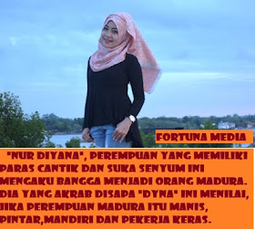 Ia yang lahir di Sumenep, Madura. NUR DIYANA mengungkapkan, bahwa perempuan Madura juga pandai menghasilkan karya seni yang spektakuler, semisal membatik. “Saat waktu luang, para ibu-ibu ada yang membatik, hasilnya bagus dan sudah terbukti,” kata Dyna yang minat bersepeda-basikal ini.