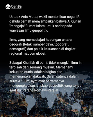 Sebagai Khalifah di bumi, tidak mungkin ilmu ini terpisah dari seorang Muslim. Memahami kekuatan dunia, adalah bahagian dari memenangkan dakwah. Salah satunya dalam Al-Qur'an Surah Ar-Rum-- ayat-ayat pertamanya mengungkapkan lanskap geopolitik yang terjadi saat itu: Perang Romawi-Persia (Rom-Parsi)!